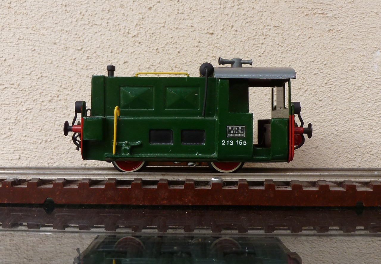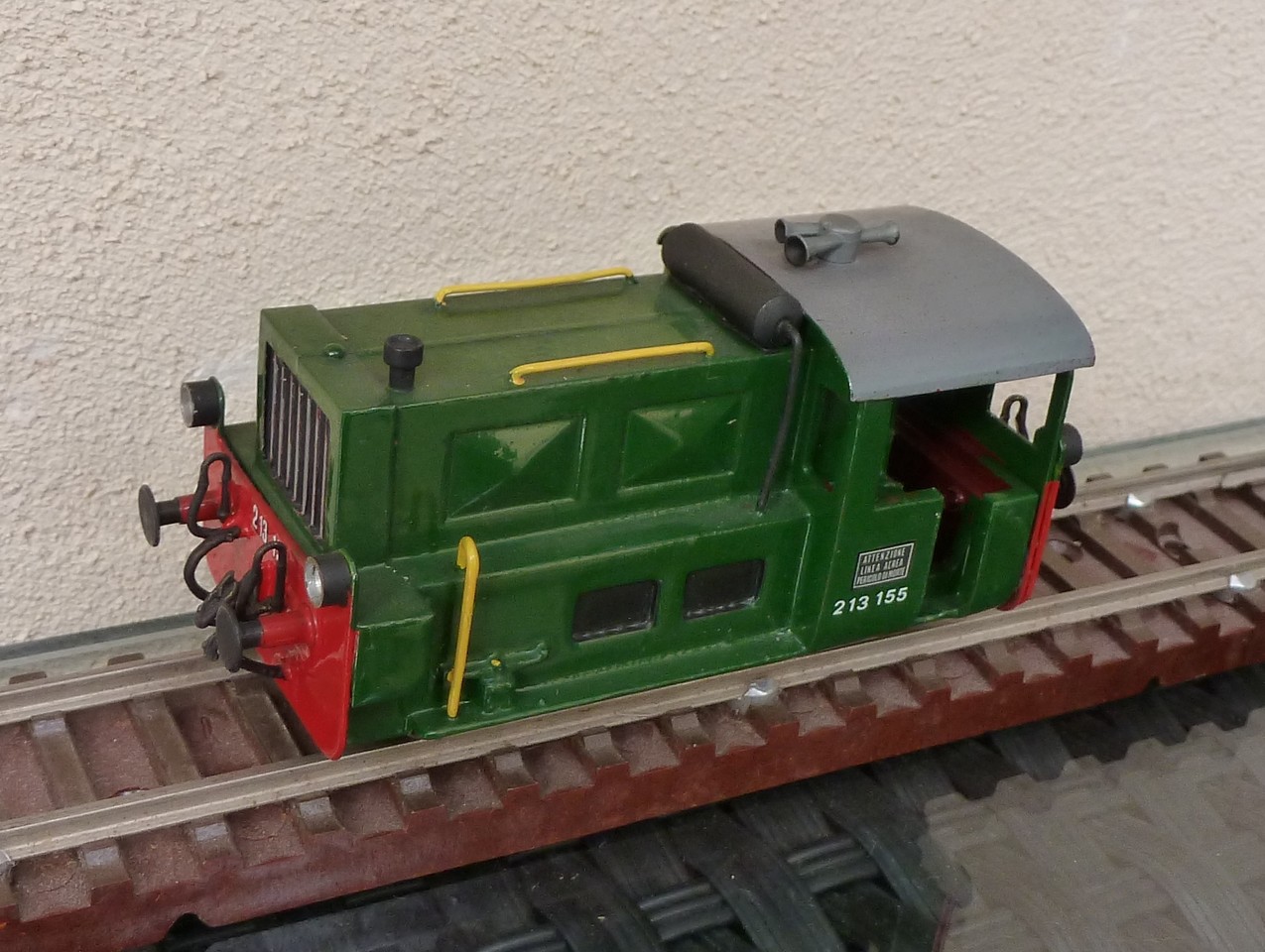 Verniciato in verde , con i corrimani gialli e l’ aggiunta delle condotte di accoppiamento freni , ganci e con le scritte d’ immatricolazione “ 213 155 ”…