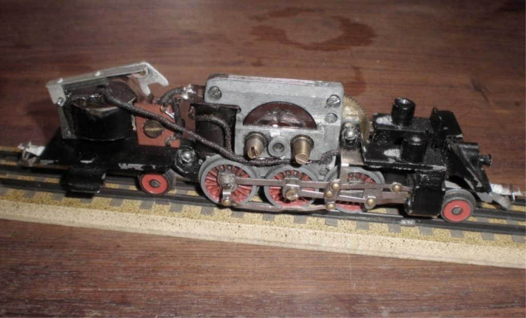 ….è caratterizzata dal motore a porta-spazzole apparenti , dal tetto della cabina con rialzo , dalle ruote portanti a raggi , in bakelite , dai corrimano in acciaio nichelato e dai ganci “ tipo Maerklin “ .