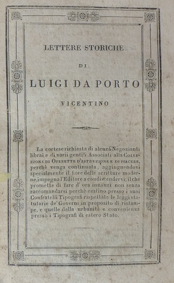“ ISTORIA novellamente ritrovata DI DUE NOBILI AMANTI con la pietosa loro morte intervenuta già nella città di Verona nel tempo del sig. Bartolommeo della Scala “